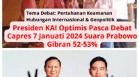 NewsRedaksiSelasa, 2 Januari 2024Selasa, 2 Januari 2024 Presiden KAI Optimis Pasca Debat Capres 7 Januari 2024 Ceruk Suara Prabowo Gibran 52-53%JAKARTA – Pilpres 2024 tinggal 43 hari lagi, sedangkan berkaca dari hasil survey pasca debat