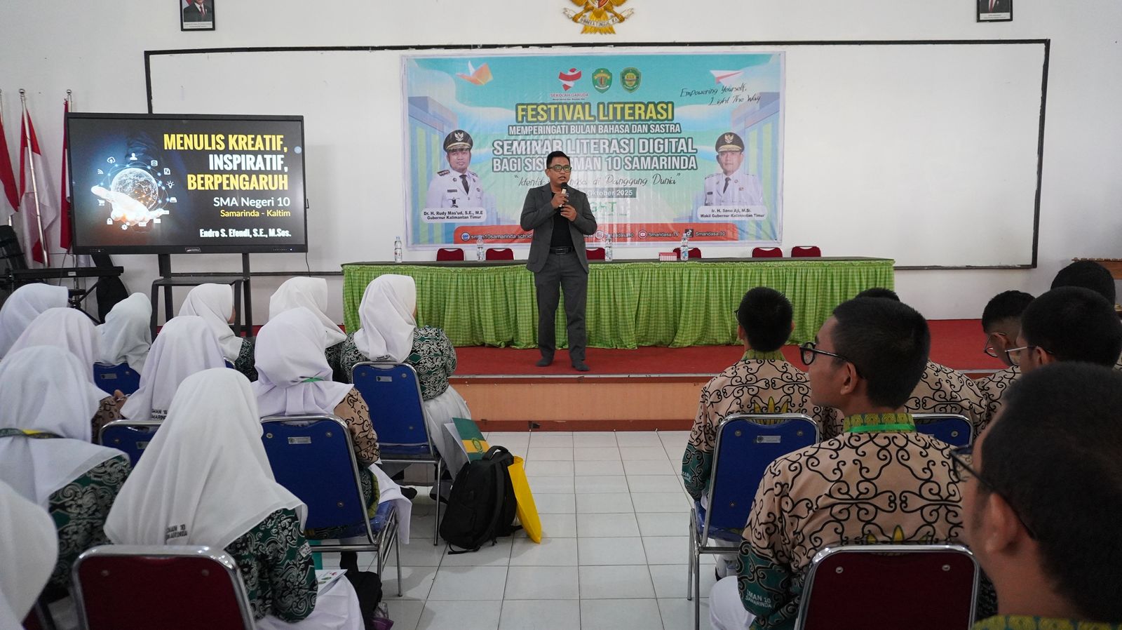 Samarinda, 9 Oktober 2025 — Dalam rangka memperingati Bulan Bahasa dan Sastra, SMA Negeri 10 Samarinda menggelar Seminar Literasi Digital bagi peserta didik kelas X di Ruang Kesenian sekolah, Kamis (9/10/2025). Kegiatan ini menjadi bagian dari rangkaian Festival Literasi Siswa yang rutin diselenggarakan setiap tahun untuk menumbuhkan semangat membaca, menulis, berpikir kritis, serta membangun integritas akademik di kalangan pelajar.